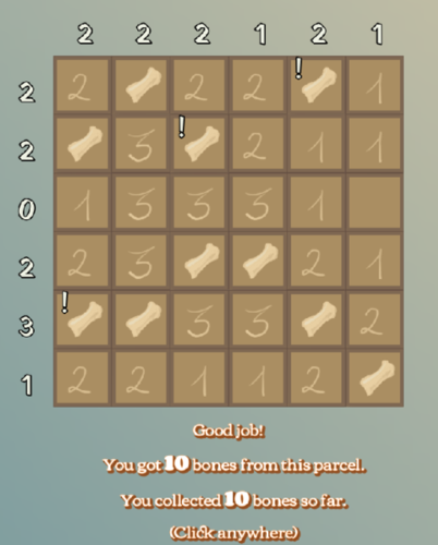 If you liked this game, you can also play Bonesweeper by Cheeseness (https://cheeseness.itch.io/). I came up with the idea of a 'fossil minesweeper' alone, but I came across this game when I was doing research on minesweepers. The dev is working on a better version called Fossil Sweeper - go check it out!