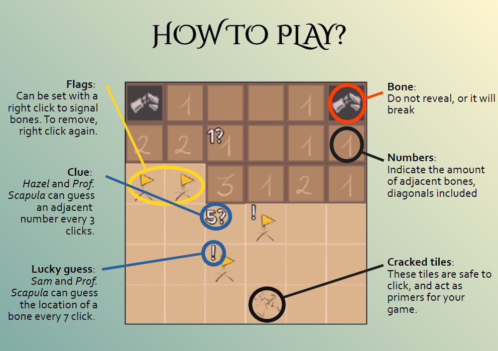 For those who never played the minesweeper (or for the unlucky who are stuck with the uncomplete jam version), here is how it is played in Bonecovery: